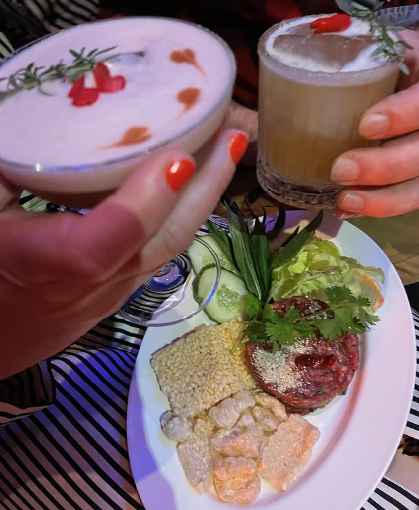 Unsere Bar lebt vom Teilen. Es geht nicht nur um Trinken – es geht darum, Zeit zu verbringen, Musik zu hören, zu reden, zu genießen. Darum gibt’s bei uns kleine Gerichte wie Yum Tang Kwa – ein Salat aus kalten Gurkenbändern, kurz gedämpften Shrimps, Zwiebeln und gerösteter Kokosflocke in säuerlicher Marinade. Oder unsere hausgemachten Hummerchips aus Lachsforelle. Alles in kleinen Portionen, perfekt zum Teilen.